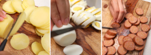 Uvařené brambory slijte, nechte vychladnout, oloupejte je a nakrájejte je na tenká kolečka. Uvařená vajíčka zalijte ledovou vodou, aby co nejrychleji vychladla. Pak z nich oloupejte skořápku a nakrájejte je na kolečka. Připravte si klobásu a i nakrájejte ji na tenká kolečka.