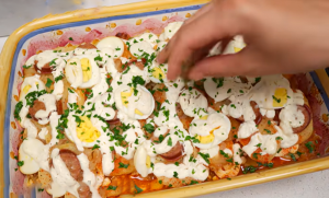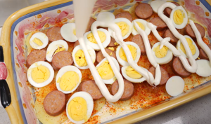 Zapékací misku vymažte lžící změklého másla a na dno vyskládejte vrstvu bramborových koleček. Osolte a opepřete a rozmístěte na brambory zkaramelizovanou cibuli, kterou posypejte červenou paprikou. Na vrstvu cibule vyskládejte v mírných rozestupech kolečka klobásy a mezi ně umístěte plátky vajíčka. Ze zdobicího sáčku vytlačte na vrstvu vajíček a klobásy vlnovku ze zakysané smetany a na ni opět vyskládejte vrstvu brambor. Opět osolte, opepřete a posypejte červenou paprikou. Pak přijde znovu cibulka, klobása a vajíčka, a nakonec znovu smetana.