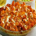 Propečené brambory nyní vyjměte z trouby, vyskládejte na stojato do kulaté formy vymazané máslem (dno předtím vysypte strouhaným sýrem – použijte cca 20 g) a přelijte sýrovou omáčkou. Dopékejte při teplotě 200 °C dalších deset minut.