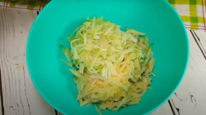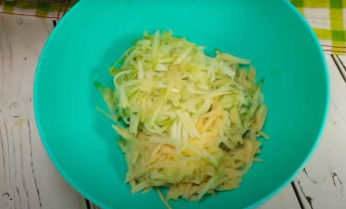 Cuketu omyjte a ořízněte její konce, následně ji na hrubém struhadle nastrouhejte do hlubší mísy, posypte solí a nechte pustit šťávu asi deset minut. Mezitím si oloupejte brambory, omyjte ve studené vodě a také nastrouhejte nahrubo do samostatné mísy.