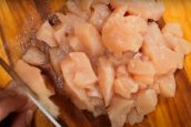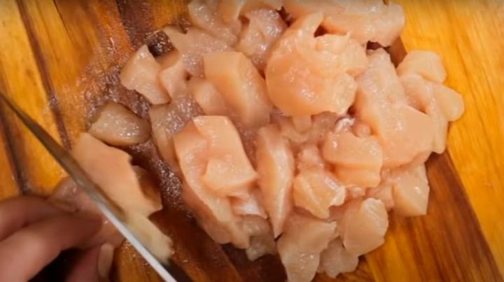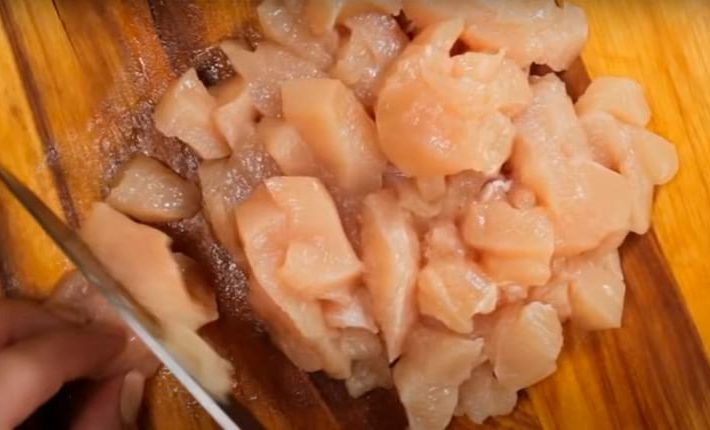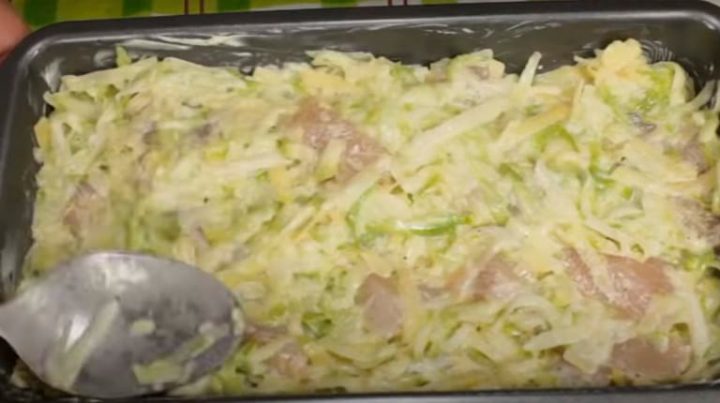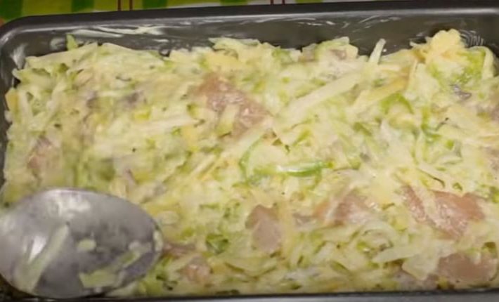 Posolte a nechte odstát asi sedm minut. Obě zeleniny pustí tekutinu, kterou následně odlijte a strouhanou cuketu s bramborami poté smíchejte dohromady. Na prkénku si odblaňte kuřecí prsa, omyjte, osušte papírovou utěrkou a nakrájejte na menší kousky. Vložte do malé misky, okořeňte lisovaným česnekem, solí a pepřem a vmasírujte do kuřecího masa. Namarinované kuřecí pak vsypte k strouhané cuketě s bramborami.