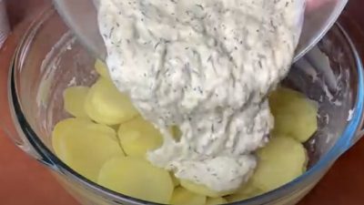 Přidejte sušený kopr s najemno nastrouhaným sýrem a ingredience důkladně zamíchejte. Polovinou směsi pokryjte brambory v míse, zakryjte ji zbytkem brambor, které potřete zbytkem sýrové směsi.