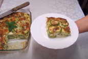 Zapněte troubu, aby se předehřála na 190 °C a k ruce si vezměte obdélníkovou zapékací misku. Na její dno vyskládejte vrstvu předvařených cuketových koleček tak, aby se vzájemně mírně překrývala.