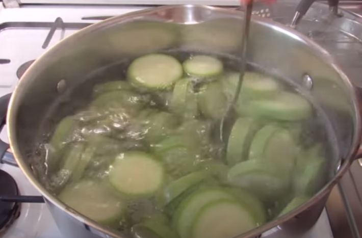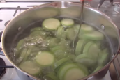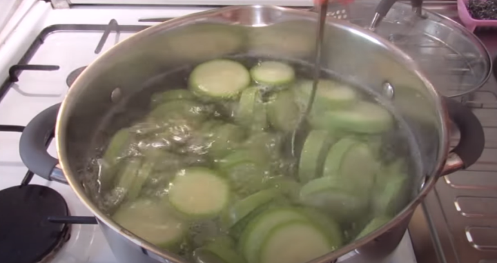 Na kamnech ve velkém hrnci přiveďte k varu vodu, kterou poté, co se začne vařit, podle chuti osolte, promíchejte a vhoďte do ní cuketová kolečka. Vařte je do poloměkka a následně je přes cedník slijte a nechte okapat.