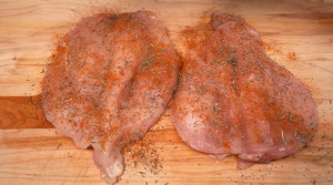 Kuřecí prsíčka umyjte pod proudem vody, osušte je papírovými utěrkami a očistěte je od přebytečných šlach. Podélně je pak ostrým nožem nařízněte tak, že na jedné z podélných stran zůstanou obě půlky asi jeden centimetr propojené. Díky tomu můžete prsíčko rozevřít na velký plát, což také udělejte. Povrch plátu (neboli vnitřek kapsy) posypejte trochou soli, mletého černého pepře, sladké mleté papriky a sušeného tymiánu. Koření pak s pomocí prstů rozetřete po celé ploše vnitřní části kapsy a dobře ho vmasírujte do masa.