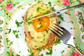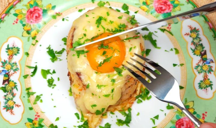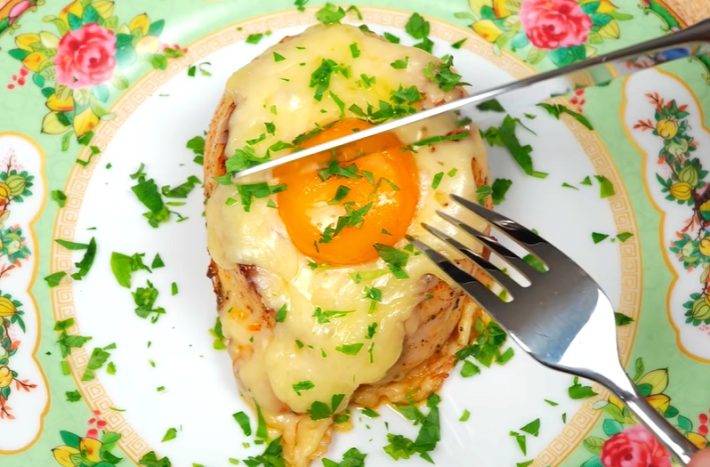 Pánev s masem vložte do trouby předehřáté na 200 stupňů péct na 10 minut. Mezitím nastrouhejte tvrdý sýr Gruyere nahrubo (můžete použít jakýkoliv jiný) a po dopečení sýr navrstvěte na kapsy. Udělejte uprostřed důlek a dejte do něj vaječný žloutek. Pečte ještě 5 až 7 minut a můžete okamžitě podávat. Dobrou chuť!