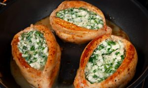 Do kuřecích prsou seshora vykrojte kapsy a poté je z obou stran osolte, opepřete a okořeňte je lžičkou červené papriky. Pro každé kuřecí prso vytvořte z alobalu kuličku a tu zabalte do pečicího papíru. Poté ji dejte do kapsy. Na pečicí pánvi rozehřejte olivový (či jakýkoliv jiný) olej a dejte na něj smažit maso na cca 6 až 7 minut z jedné strany a dalších 5 minut z druhé.