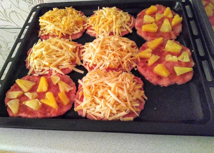 Zapečené kuřecí karbanátky s ananasem a strouhaným sýrem - postup přípravy