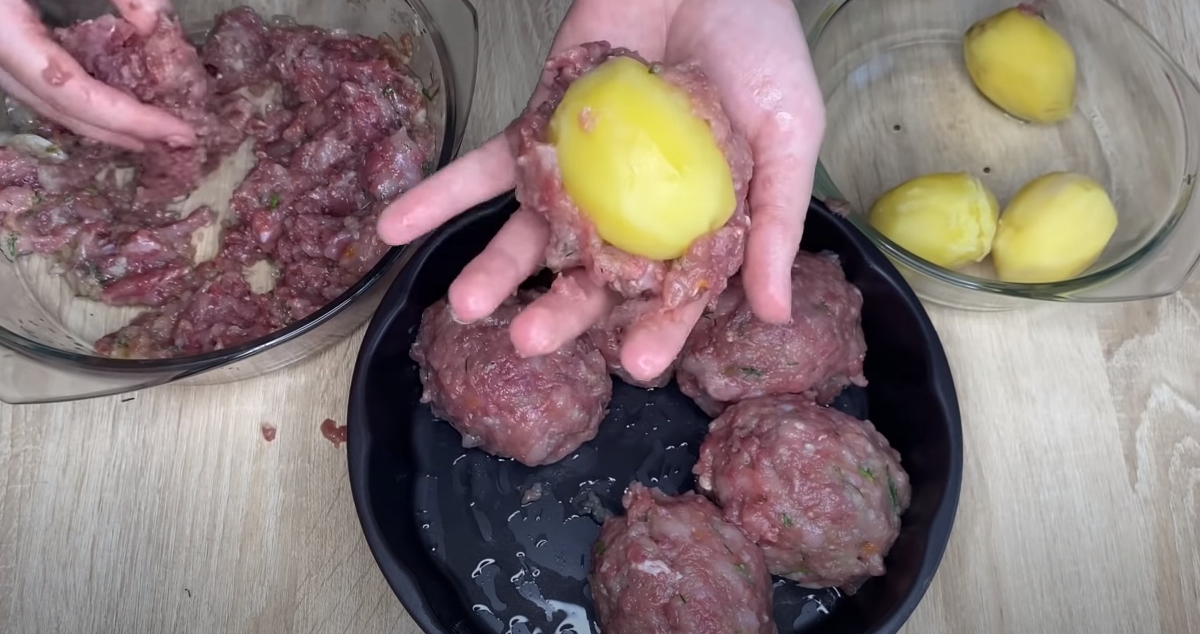 Až se brambory uvaří, sveďte je a nechte chvíli zchladnout. Následně se pusťte do kompletace pokrmu. Z mletého masa tvořte placky a do nich zabalujte uvařené brambory vcelku.