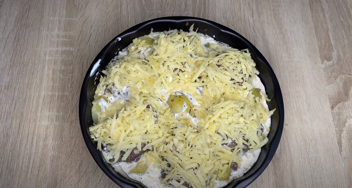 Nyní si připravte ještě zapékací omáčku ze zakysané smetany, mléka, soli a oblíbeného grilovacího koření. Tu vlijte rovnoměrně na pokrm, posypte strouhaným sýrem, vše překryjte navlhčeným pečícím papírem (mokrou stranou dolů) a dejte péct do trouby na asi 40 minut při teplotě 180 °C.