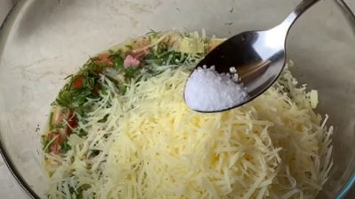 Ve větší míse smíchejte rozšlehaná vejce s nakrájenými rajčaty, jarní cibulkou, klobásou a nasekaným koprem. Přidejte prolisovaný česnek a nastrouhaný sýr.