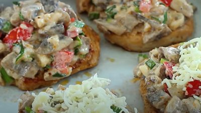Na plátky masa naneste houbovou směs, kterou posypte zbytkem nastrouhané mozzarelly a pokrm pečte v předehřáté troubě na 220 °C po dobu 20 minut.
