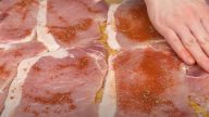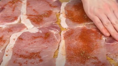 Maso omyjte vodou, osušte papírovou utěrkou a nakrájejte ho na plátky o šířce cca 1,5 cm. Ty naklepejte a ochuťte směsí soli, pepře papriky a rozmarýnu. Plátky masa zakryjte a nechte pár minut marinovat.