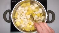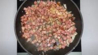 K bramborám přidejte růžičky květáku a zeleninu vařte 10 minut. Mezitím na pánvi s rozpáleným olejem smažte nadrobno nakrájenou cibuli s česnekem a anglickou slaninou 2–3 minuty.