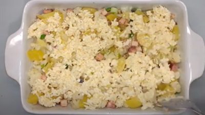 Pokrm ochuťte solí, pepřem a důkladně zamíchejte. Poté ho zalijte sýrovou směsí a pečte v předehřáté troubě na 180 °C po dobu 45 minut.