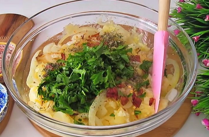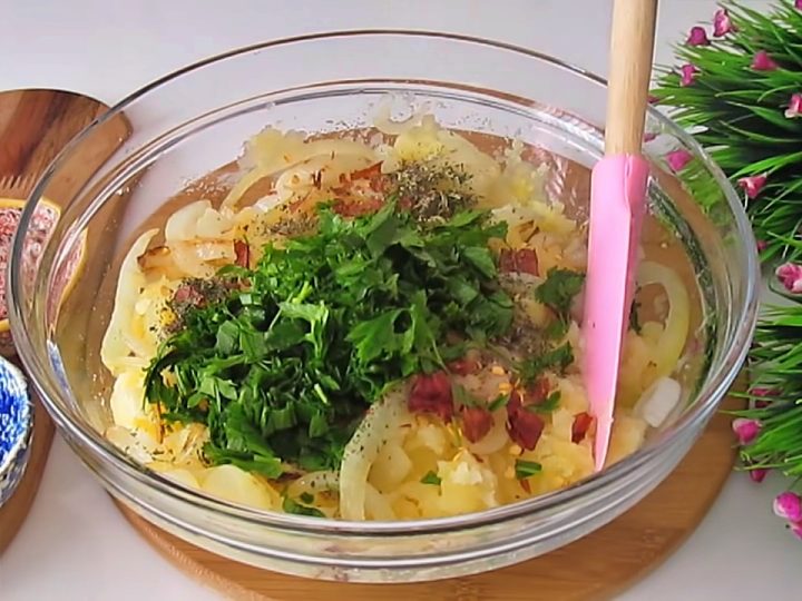 Tři brambory oloupejte a nakrájejte je na menší kostky. Vložte je do hrnce a v osolené vodě je uvařte doměkka. Oloupejte dvě cibule a nakrájejte je na tenké půlměsíčky. Vložte je do pánve, zalijte olejem a na plotně osmažte dorůžova. Uvařené brambory v míse rozmačkejte na kaši a vyklopte k nim osmaženou cibuli. Směs dobře promíchejte a přidejte k nim nadrcené chilli papričky (ale můžete je i vynechat). Přidejte po jedné lžičce sušené máty, mletého černého pepře a tymiánu a nahrubo nasekanou čerstvou petrželku a vše dobře promíchejte.