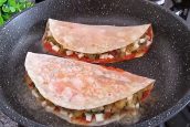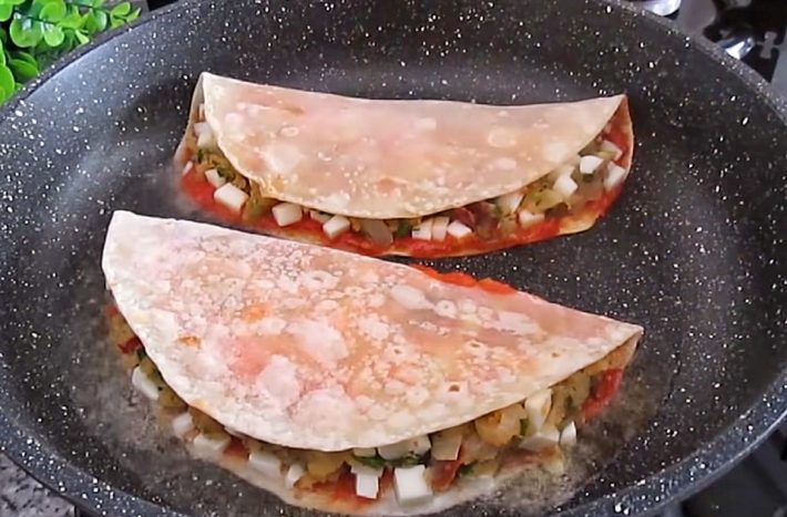 Každý opečený lavash potřete po celé ploše rajčatovou omáčkou. Na polovinu placky rozmístěte trochu krájeného či strouhaného sýra a vložte jednu lžíci bramborové náplně. Znovu posypejte sýrem a druhou půlku placky přehněte přes náplň. Na sporáku rozehřejte pánev s trochou oleje a každý plněný lavash pečte z obou stran dozlatova. Hotovou dobrotu nechte mírně zchladnout a podávejte.