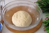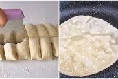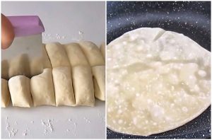 Odpočaté těsto vyválejte do válečku, rozdělte ho na 14 kousků a každý z nich vytvarujte do kuličky. Každou kuličku pak rozválejte na tenkou placku. Rozehřejte suchou pánev a nechte každou placku opéct na 30 sekund z obou stran.