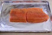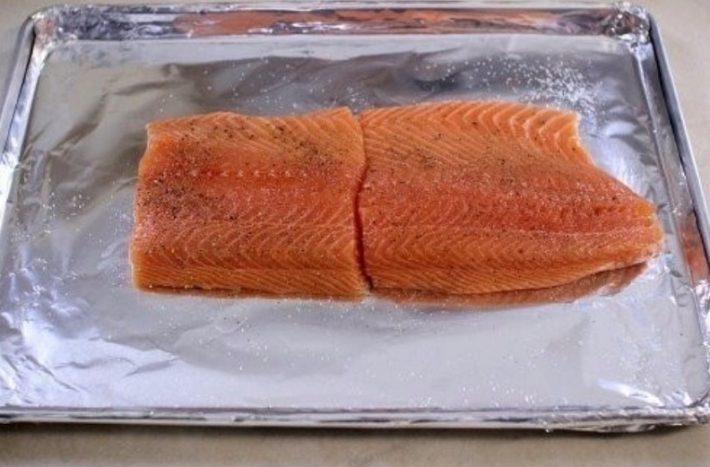 Připravte si plech na pečení a vyložte ho po celé ploše alobalem. Na ten pak položte očištěného lososa a podle chuti maso posypejte solí a černým nebo bílým pepřem.