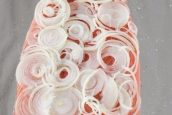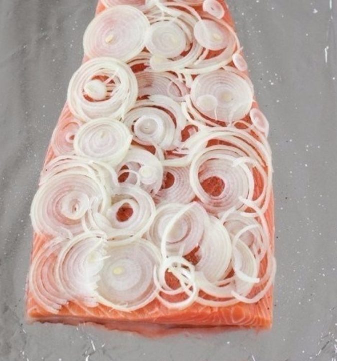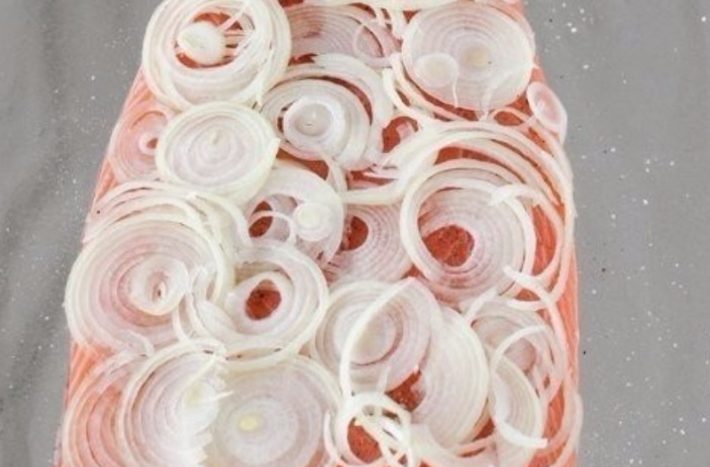Oloupejte a omyjte cibuli a nakrájejte ji na tenká kolečka či půlkolečka, která rovnoměrně rozprostřete po celé ploše rybího filetu.
