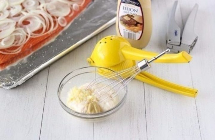 Do misky si odměřte 200 gramů majonézy, přidejte k ní dvě lžíce citronové šťávy, jednu lžíci hořčice a prolisujte do směsi také dva stroužky česneku. Metličkou nebo jiným vhodným nástrojem ingredience vzájemně důkladně promíchejte.