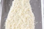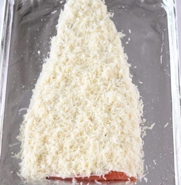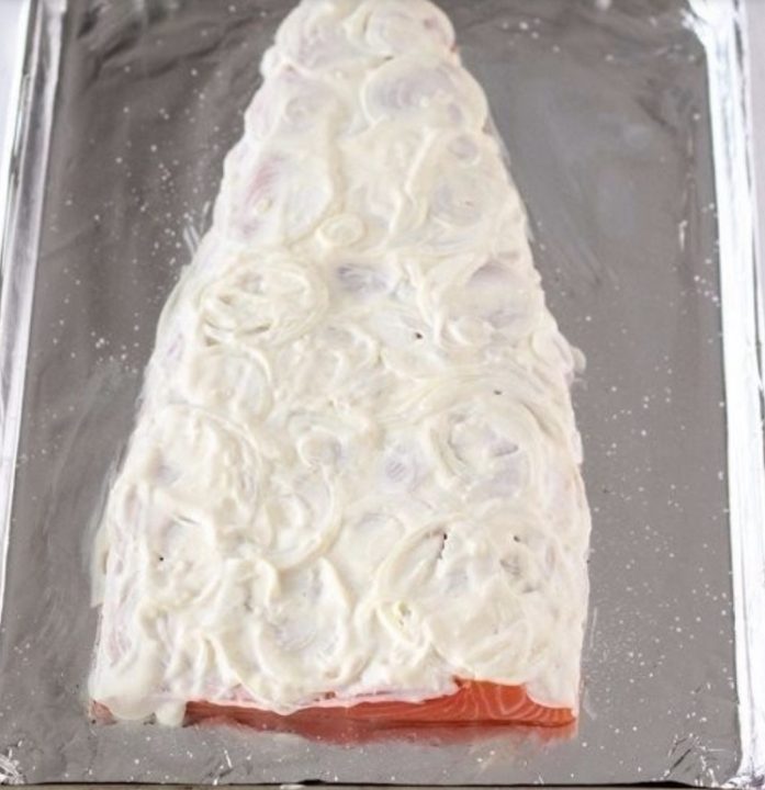 Získanou ochucující směs naneste na filet s cibulí a silikonovou mašlovačkou ji po celém povrchu důkladně rozetřete. Nastrouhejte oba druhy sýra a bohatě jím zasypejte celého lososa.