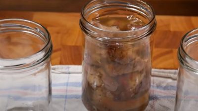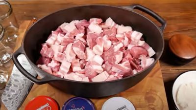 Pekáč vložte do předehřáté trouby a teplotu 200 °C a maso pečte 90 minut. Poté ho vyjměte, výpečky přendejte do čistých zavařovacích sklenic a zalijte je rozpuštěným sádlem.