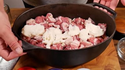 Vepřový bok a vepřovou krkovici nakrájejte na středně velké kostky. Následně je přendejte do pekáče. Česnek oloupejte a nakrájejte ho nadrobno. Poté ho přidejte k masu.