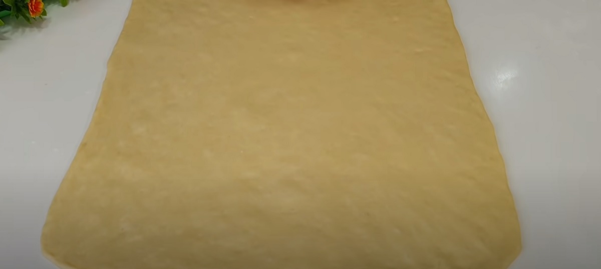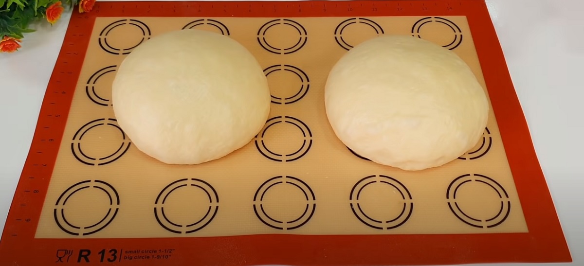 Ty překryjte potravinovou fólií a nechte ještě čtvrt hodiny nakynout. Dále si jeden z kusů těsta vyválejte na větší plát.