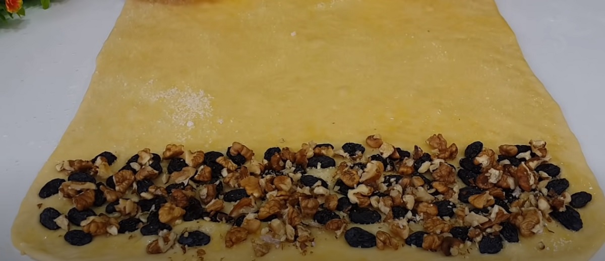 Potřete jej rozpuštěným máslem, posypejte cukrem a na jednu stranu plátu nasypte směs oříšků a sušeného ovoce.