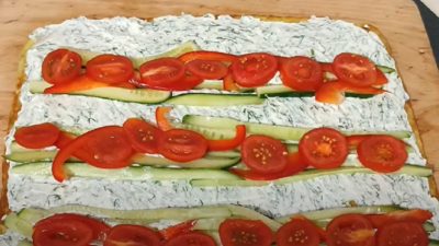 Po upečení nechte základ rolády chladnout, smetanovou směsí ho potřete a ve třech pruzích ho pokryjte nakrájenými okurkami, rajčaty a paprikou.
