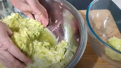 Z cukety odřízněte okraje, zbytek zeleniny nastrouhejte na hrubém struhadle, smíchejte ji se solí a nechte odpočívat 10–15 minut.