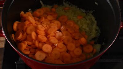 Nakrájenou mrkev přidejte do hrnce s cibulí, kde ji 2–3 minuty smažte. Zeleninu zalijte vývarem a polévku vařte 10 minut, pod pokličkou.
