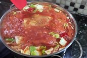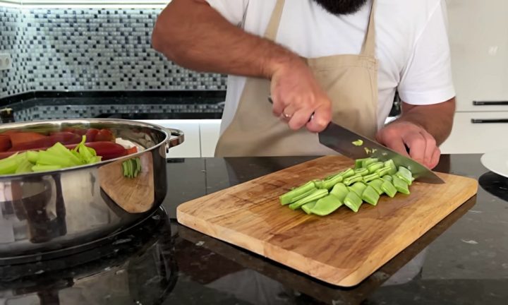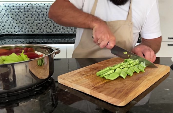 Papriky zbavte stopek, jádřinců a zbytků semínek a nakrájejte je na velké kousky. Cibuli oloupejte a nakrájejte ji nahrubo. Totéž udělejte také s rajčaty, mrkví, řapíkatým celerem, fazolovými lusky i hlávkovým zelím.