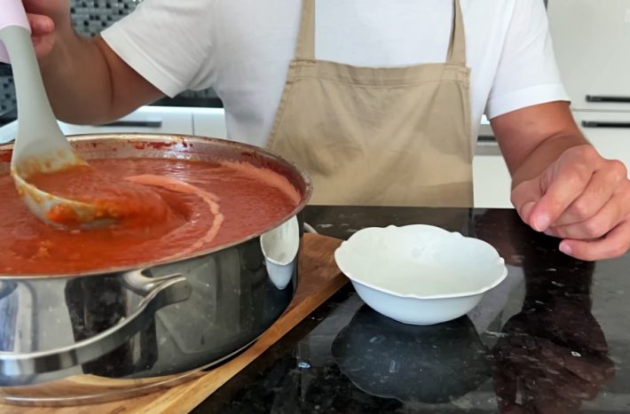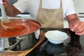 Všechny druhy zeleniny vhoďte do hrnce, zalijte je rajčatovou šťávou a dolijte vodou až po okraj hrnce. Vše přiveďte k varu a vařte 10 až 15 minut. Poté polévku promíchejte, přiklopte pokličkou a vařte opět 10 až 15 minut, dokud všechna zelenina úplně nezměkne.