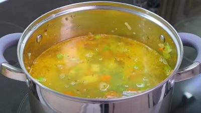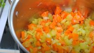 Cibuli nakrájejte nadrobno a smažte ji v hrnci s rozpáleným olejem 2–3 minuty. K cibuli přidejte nadrobno nakrájený česnek s oloupanou a nakrájenou mrkví a řapíkatým celerem.