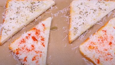 Krajíce posypte solí, sušeným česnekem a nastrouhaným parmazánem. Polovinu z krajíců posypte mletou sladkou paprikou a druhou oreganem. Chléb následně pečte v předehřáté troubě na 180 °C po dobu 10 minut.