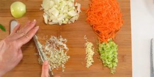 Brambory umyjte, oloupejte a nakrájejte na kostičky. Vložte je do hluboké mísy a zalijte studenou vodou. Nechejte je chvíli odpočívat a mezitím si připravte zeleninu. Mrkev nastrouhejte na větší kousky, Celer nakrájejte, cibuli oloupejte a nakrájejte nadrobno a česnek buďto prolisujte, anebo také nakrájejte.