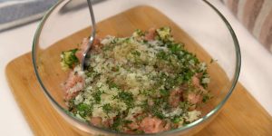 Mleté kuřecí maso vložte do větší mísy a přidejte k němu jednu cibuli s prolisovaným česnekem. Poloviční množství zeleniny k němu dodejte také. Dochuťte solí, mletým černým pepřem a jedním muškátovým oříškem. Promíchejte směs dohromady a nechejte chvíli odležet.