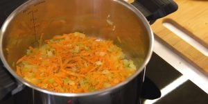 Nachystejte si hrnec, ve kterém budete polévku připravovat, a rozehřejte na ní trochu rostlinného oleje s máslem. Dodejte cibuli, kterou opékejte cca dvě minuty, poté přidejte i mrkev, celer a česnek. Za stálého míchání smažte okolo pěti minut. Následně dochuťte solí a pepřem.