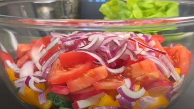 K okurkám přidejte nakrájenou papriku, ředkvičky, rajčata a na proužky nakrájenou cibuli.