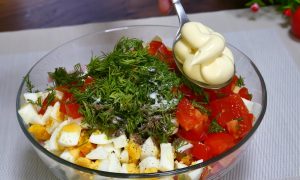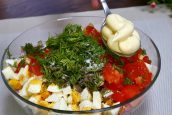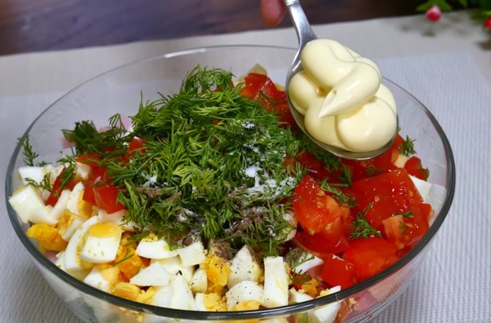 Nakonec přidejte krájená rajčata a vše posypejte koprem, petrželkou nebo jiným druhem oblíbených bylinek. Salát podle chuti osolte a opepřete. Poté ho zakápněte majonézou, jogurtem či zakysanou smetanou (anebo jejich směsí), případně svým oblíbeným domácím dresingem a salát důkladně promíchejte, aby se všechny kousky použitých surovin obalily zálivkou. Hotový salát rozdělte na talíře, posypejte bylinkami a podávejte.