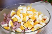 Polotvrdý sýr, který máte rádi (např. Eidam, gouda atd.) nastrouhejte nahrubo. Šunku nakrájejte na kostky a obojí přidejte do salátové mísy.