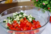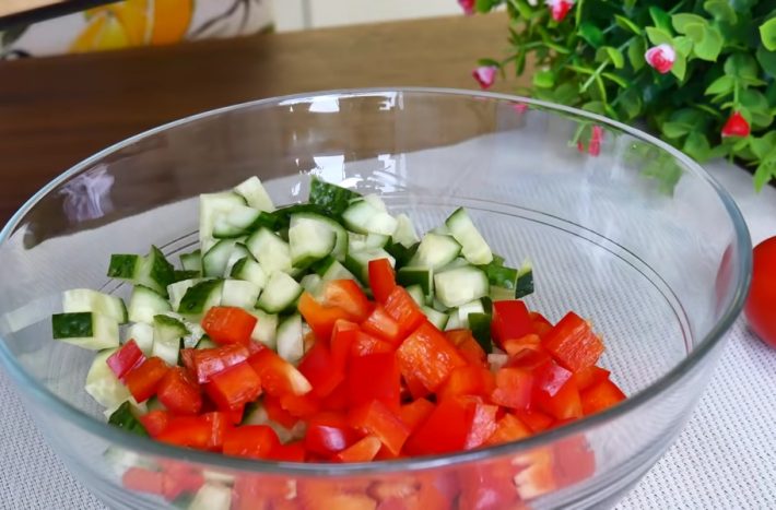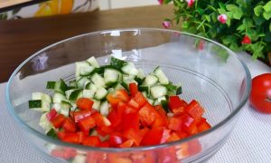 Dvě polní okurky nakrájejte na drobné kostičky. Namísto polní okurky můžete použít klasickou salátovou. Totéž udělejte i s paprikou, kterou jste nejprve zbavili jádřince i zbytků semínek. Oba druhy zeleniny vsypte do velké salátové mísy.