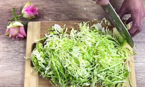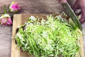 Polovinu hlávky zelí zbavte tuhého košťálu a zbytek nakrájejte ostrým nožem na tenké nudličky. Vložte je do mísy, posypejte je solí a rukama promněte a promačkejte, dokud zelí nezesklovatí a nezkřehne.