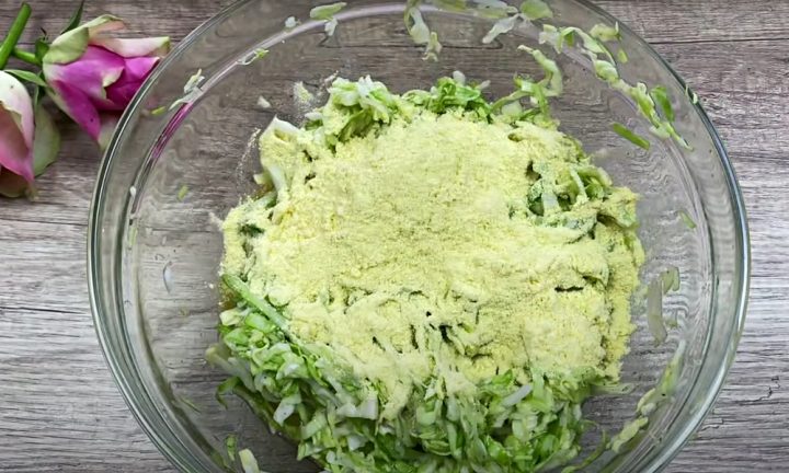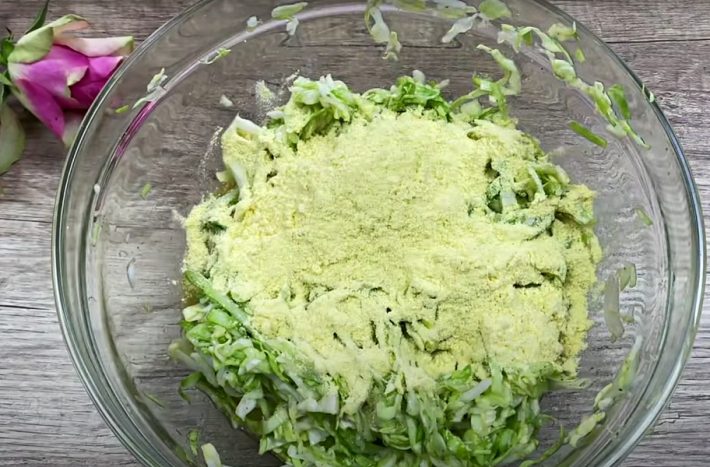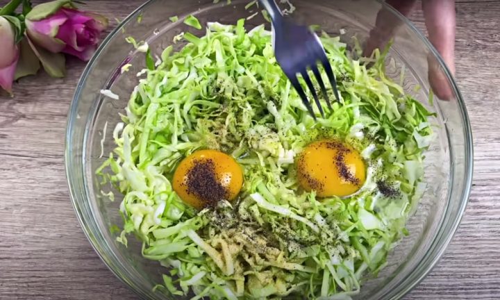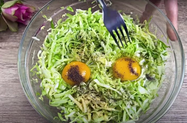 K zelí přidejte dvě vejce, mletý černý pepř a sušený česnek a důkladně promíchejte, aby se všechno zelí obalilo vajíčkem. Přisypejte kukuřičnou mouku a znovu promíchejte, čímž získáte soudržné těsto.
