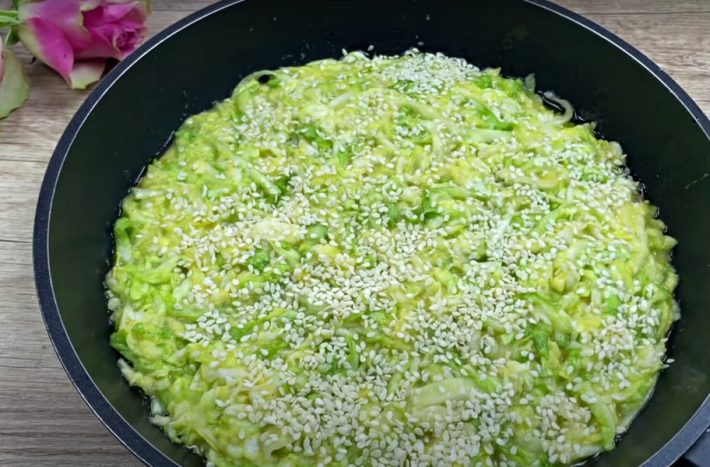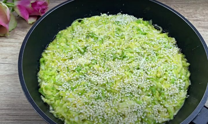 Připravte si pánev se silným dnem, kterou vymažte olivovým olejem a vložte do ní zelnou směs, kterou vytvarujte do rovnoměrné placky. Její povrch posypejte sezamovými semínky, přiklopte ji pokličkou a položte na sporák.