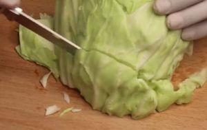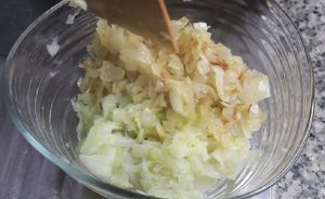 Čtvrtinu hlávky zelí zelí zbavte košťálu a nakrájejte na menší kousky. Ty dejte do hrnce s vodou a vařte 10 minut, aby zelí změklo. Mezitím si nakrájejte cibule na kostičky, dejte je na pánev s olejem a smažte, aby cibule krásně zesklovatěla.