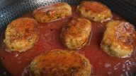 K osmaženým karbanátkům vlijte omáčku, vytvořenou z rajčatového protlaku, vody a soli. Karbanátky vařte ještě 5 minut, pod pokličkou a poté je servírujte s oblíbenou přílohou.