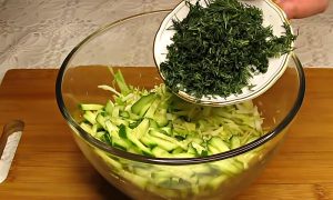 Zelí nakrájejte na tenké nudličky a vložte je do hluboké salátové mísy. Okurku nakrájejte na tenké plátky, které rozkrájejte na malé hranolky, kopr a česnek nasekejte najemno a vše přidejte do mísy k zelí. Nakonec nakrájejte na nudličky připravené smaženky a přidejte je do mísy k zelenině.